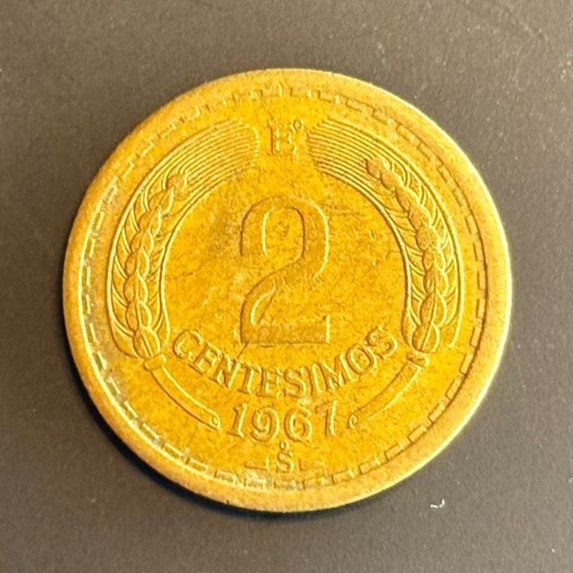 Moneda original de 2 Céntimos de Chile, año 1967, ceca de Santiago (“S”). • Metal: bronce • Peso: ~2 g – Diámetro: 17 mm • Estado: circulada (MBC+).