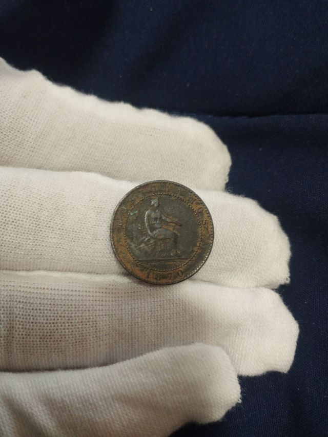 -2 centimos de peseta acuñada en 1870 en Barcelona OM , escudo de españa bien visible Hispania sentada se aprecia la cara bonita moneda, estado medio/ bueno mirar fotos