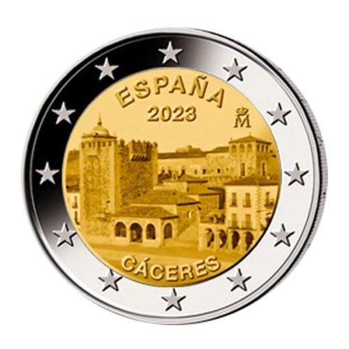 Detalles del productoEl color de la corona circular exterior es blanco plata y el color de la zona interior, amarillo oro. El Anverso de la moneda muestra una vista de la Plaza Mayor de Cáceres. En la parte superior, en mayúsculas y en sentido circular, aparece la leyenda ESPAÑA y el año de acuñación 2023; debajo, la marca de Ceca.