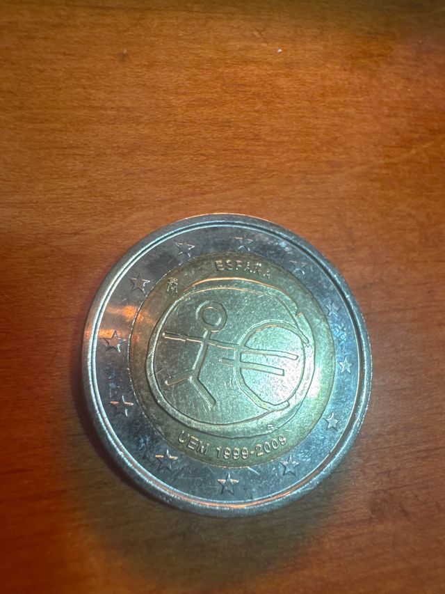 Moneda conmemorativa de 2 euros de España. - Conmemora la Unión Económica y Monetaria (UEM) 1999-2009. - Diseño especial con figura y símbolo del euro.