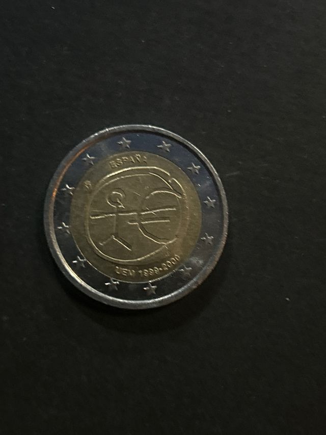 Moneda conmemorativa de 2 euros de España. - Diseño conmemorativo de la UEM 1999-2000. - Borde exterior con estrellas.