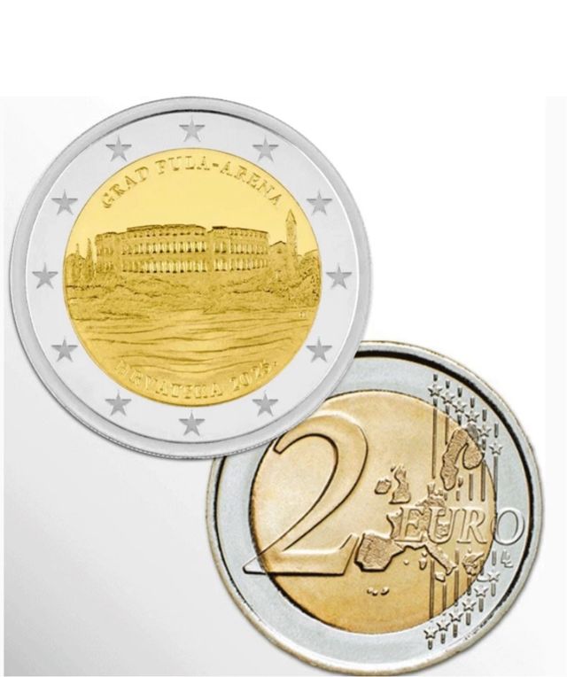 Moneda conmemorativa de 2 euros de Croacia, año 2025, con diseño de la Arena de Pula.