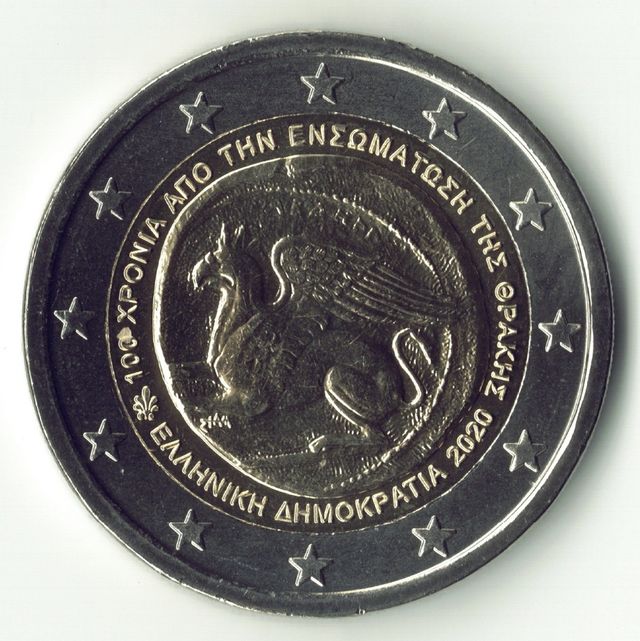 El motivo reproduce una antigua moneda de la ciudad tracia de Abdera, con un grifo. En semicírculo de abajo a arriba figuran las leyendas en griego «CENTENARIO DE LA UNIÓN DE TRACIA CON GRECIA» y «REPÚBLICA HELÉNICA», el año de emisión «2020» y una palmeta (la marca de ceca griega). A la izquierda se ve también el monograma del artista (George Stamatopoulos). La región de Tracia, situada en el extremo nordeste del país, se unió a Grecia tras el fin de la Primera Gue