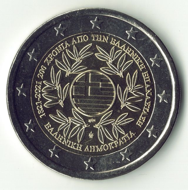 El motivo central presenta la bandera griega rodeada por ramas de laurel. En semicírculo de abajo a arriba figuran las inscripciones en griego: «1821-2021 DOSCIENTOS AÑOS DE LA REVOLUCIÓN GRIEGA» y «REPÚBLICA HELÉNICA». En la parte inferior, entre dos ramas de laurel, se encuentra una palmeta (marca de ceca de la Casa de la Moneda griega) y la firma del artista (George Stamatopoulos). En el borde circular de la moneda figuran las doce estrellas de la bandera europea.