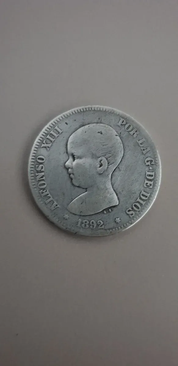 Moneda de 2 pesetas de plata con el busto de Alfonso XIII. - Año: 1892 - Leyenda: ALFONSO XIII POR LA G. DE DIOS - Canto: Estrellas y números