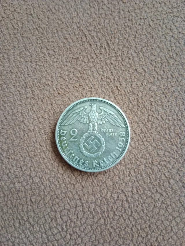 Moneda de 2 Reichmark del año 1938. - Diseño con águila imperial. - Inscripción Deutsches Reich y Reichsmark. - Año de acuñación: 1938.