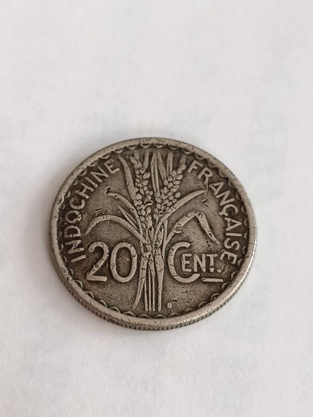 Detalles del productoMonedas antiguas de Indochina Francesa de 1941. Esta moneda de 20 céntimos presenta un diseño clásico.