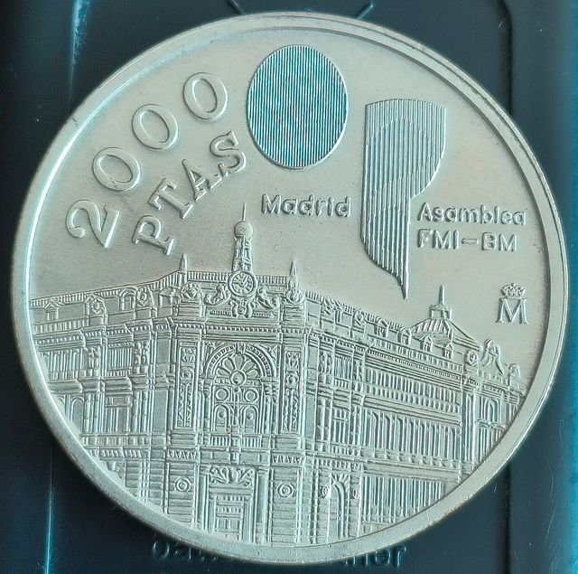 Detalles del productoMoneda conmemorativa de 2000 pesetas de plata de 1994, emitida por España con motivo de la Asamblea del Fondo Monetario Internacional y el Banco Mundial (FMI-BM) celebrada en Madrid.