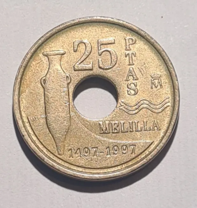 Detalles del productoMoneda original de 25 pesetas (1997), perteneciente a la serie de Comunidades Autónomas, dedicada a Melilla.