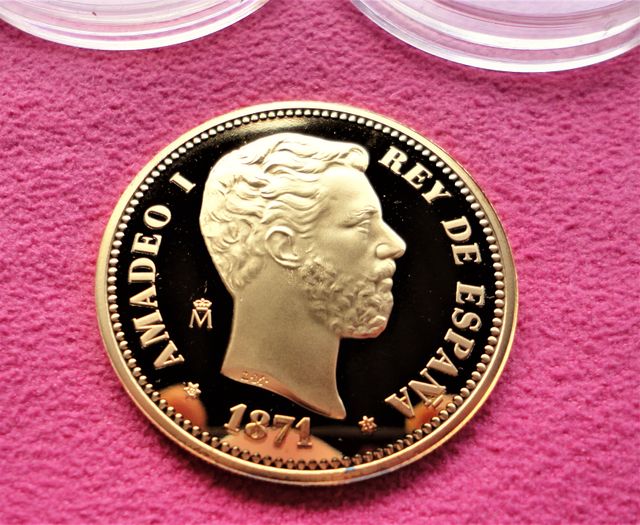 Detalles del productoMONEDA 25 PESETAS ORO AMADEO I, 1871. MACIZA DE PLATA DE LEY CON LÁMINA DE ORO 24k. 33 mm. DIÁMETRO. EMISION ESPECIAL COLECCIONISTAS ACUÑADA POR LA FNMT EN FLOR DE CUÑO. PERFECTA, VER FOTOS, SIEMPRE EN SU CÁPSULA. Adjunto copia del certificado de la FNMT.