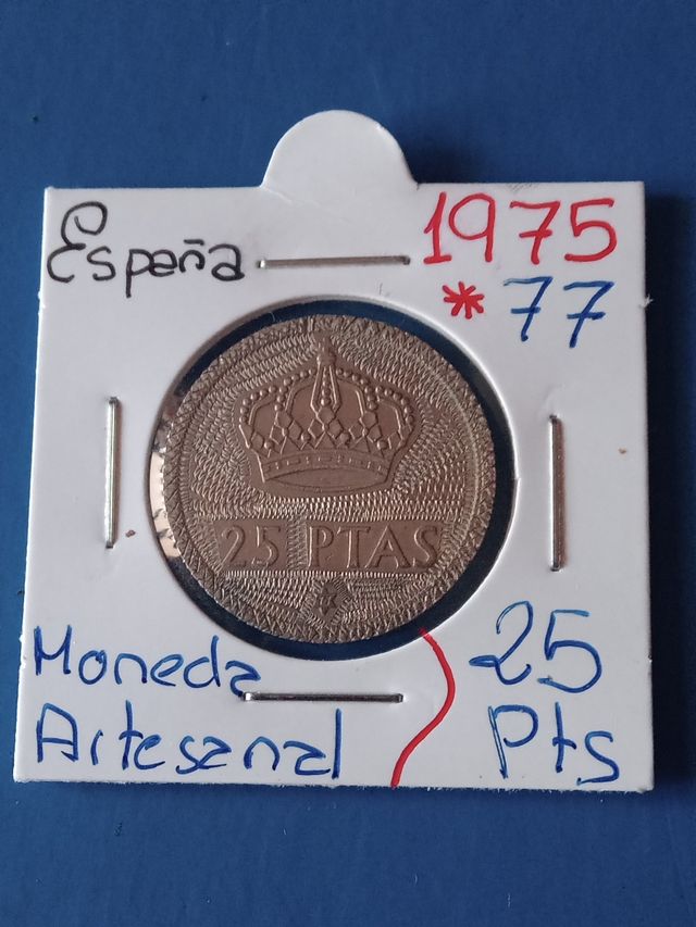 Detalles del productoPreciosa moneda artesanal de 25 pesetas españolas, conmemorativa del año 1975 estrella 77.... Se encuentra en buen estado de conservación. - Moneda de 25 pesetas. - Conmemorativa del año 1975.*77. - Elaboración artesanal. - Diseño con corona real.