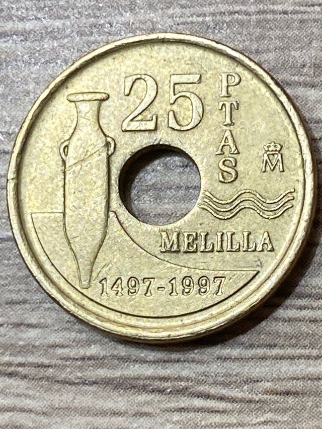 Detalles del productoPreciosa moneda antigua de 25 Ptas de Melilla, conmemorativa del aniversario 1497-1997. Se encuentra en buen estado de conservación.