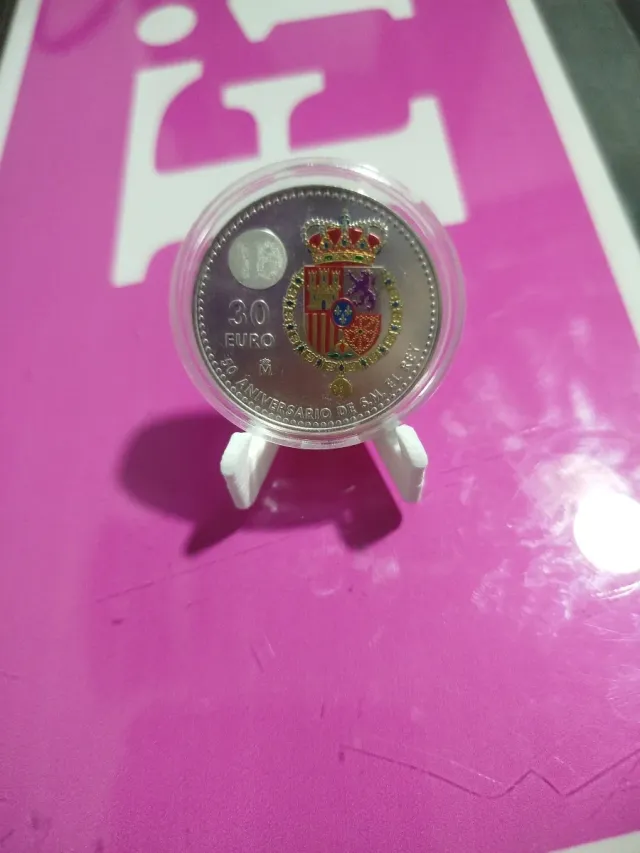 Moneda conmemorativa de 30 Euros. - Diseño con escudo y corona. - Inscripción 50 ANIVERSARIO DE S.M. EL REY. - Acabado plateado.