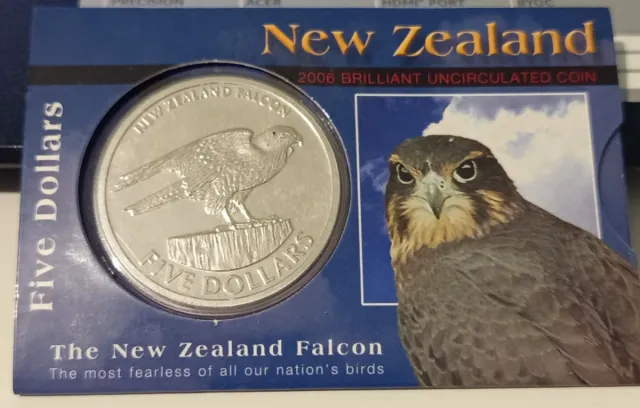 Detalles del productoMoneda de 5 dólares de Nueva Zelanda del año 2006, con la imagen del halcón.
