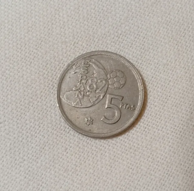 Moneda de 5 pesetas de España del año 1982. - Diseño con balón de fútbol y mapa. - Inscripción PTAS y 80 con estrella.