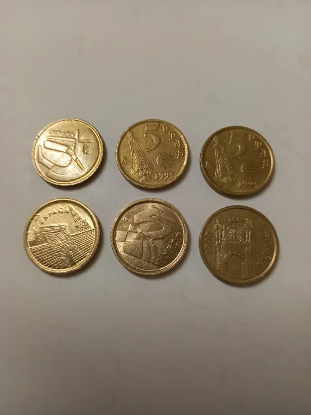 Seis monedas de 5 pesetas de los años 1992, 1993 (Jacobeo), 1993 (Jacobeo), 1996 (La Rioja), 1998 y 1999 (Murcia).