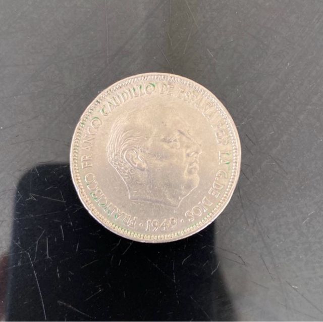 Detalles del productoSe ofrece moneda de cinco pesetas española. Es una moneda de Francisco Franco, acuñada en 1949. - Muestra el escudo de España en un lado. - En el otro lado, aparece el perfil de Franco. - La moneda está en buen estado de conservación.