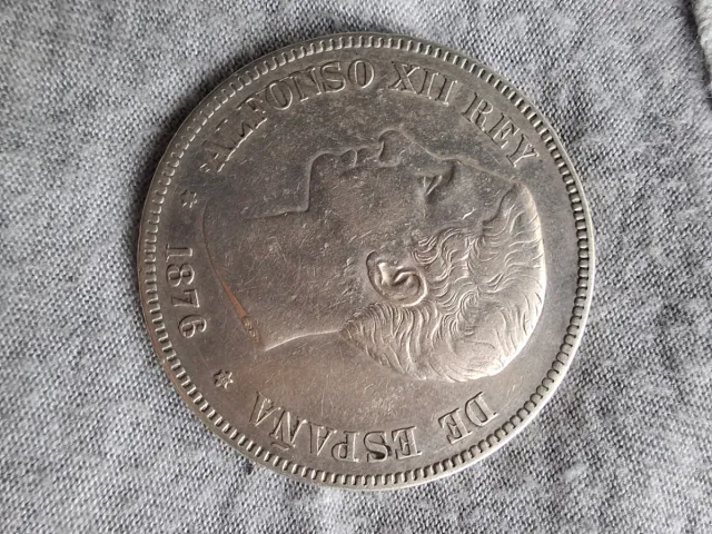Moneda de plata de 5 pesetas del año 1876, con la efigie de Alfonso XII. - Canto con inscripción. - Diseño detallado de la época. - Estrella 76 - Peso 25gr