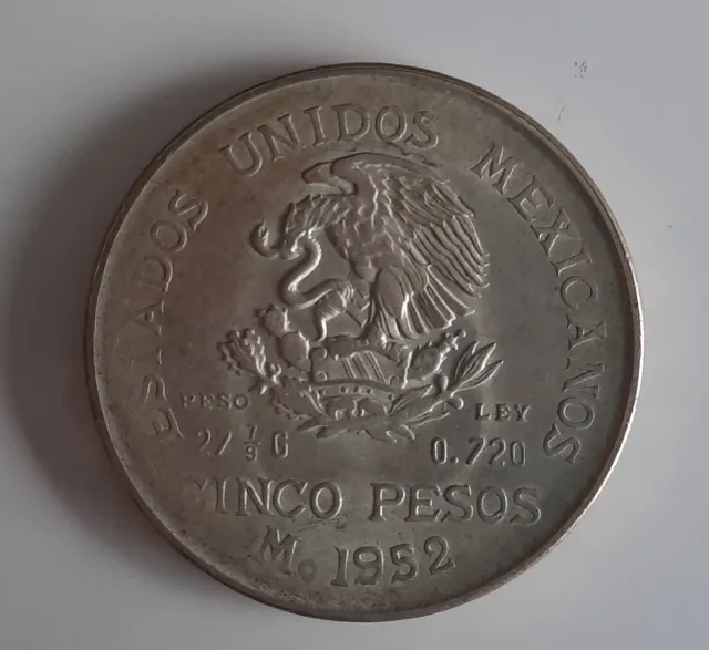 Moneda de colección de los Estados Unidos Mexicanos. - Año: 1952 - Denominación: Cinco Pesos - Peso: 27.7 g - Ley: 0.720