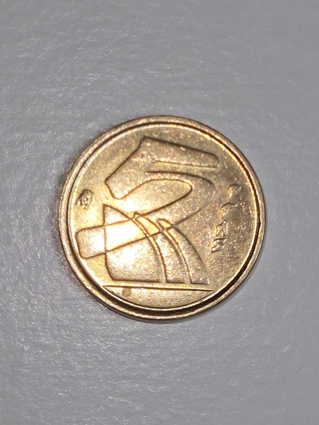 Moneda de 5 pesetas de España, acuñada en el año 1991. - Diseño con el número 5. - Canto liso. - Giro correcto.