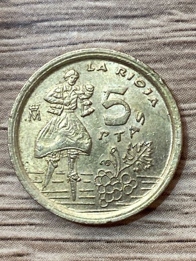 Detalles del productoSe ofrece moneda antigua de 5 Ptas de La Rioja. Es una moneda de colección, con señales de uso visibles en las imágenes.