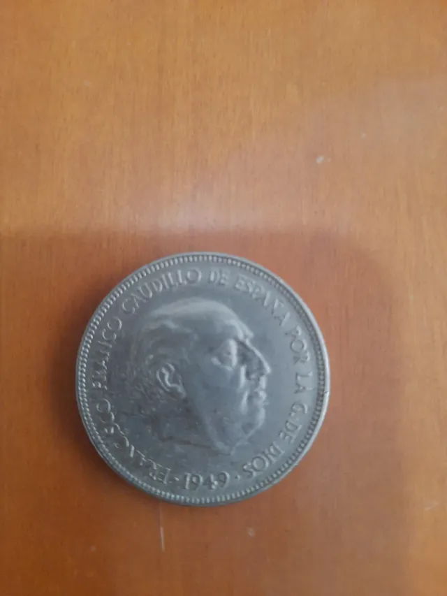 Moneda de 5 pesetas del año 1949. - Anverso: Retrato de Francisco Franco. - Leyenda: FRANCISCO FRANCO CAUDILLO DE ESPAÑA POR LA G. DE DIOS 1949.