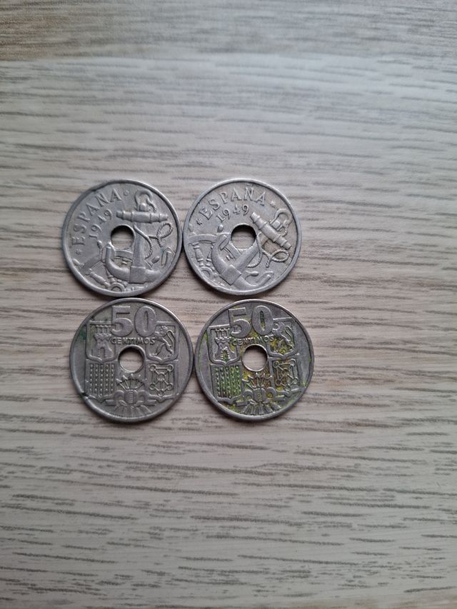 Moneda de 50 centavos de España con el año 1949. - Diseño con escudo. - Agujero central característico. -Precio de cada una 5 € -Precio de las 4 por 15 €