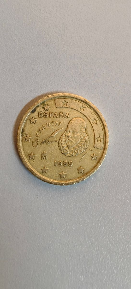 Monedas de 50 céntimos de euro españolas, acuñadas en 1999. La moneda muestra el retrato de Miguel de Cervantes. - Está en buen estado. - Se incluye una moneda.