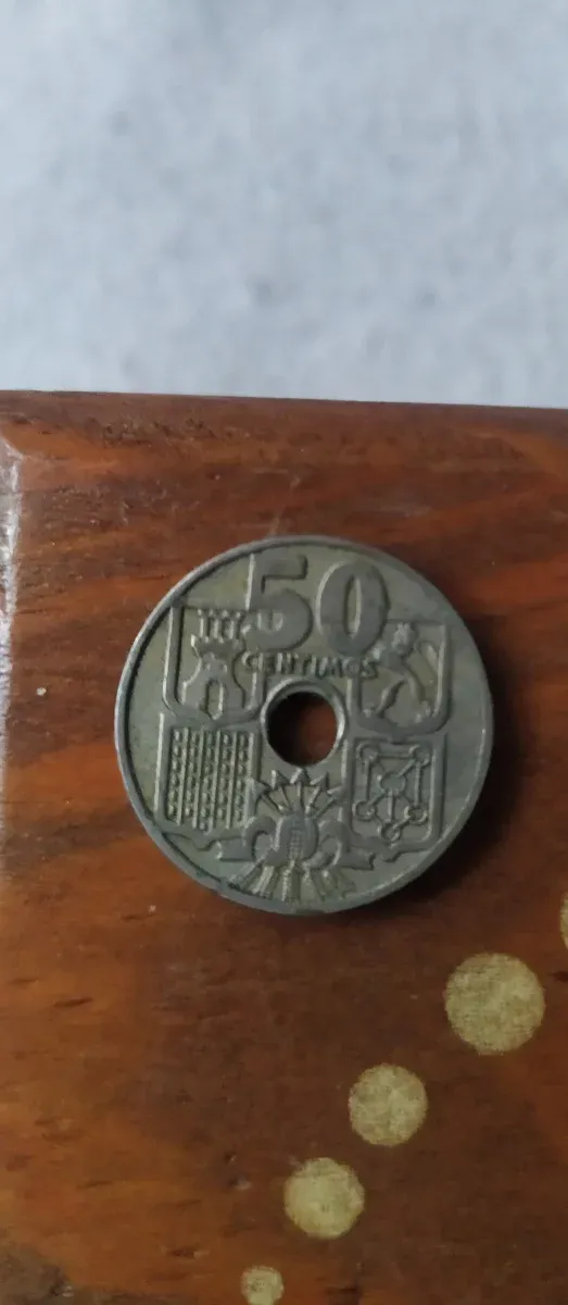 Moneda de 50 céntimos de peseta con un error de acuñación agujero desplazado. - Diseño con escudo. - Agujero central característico.