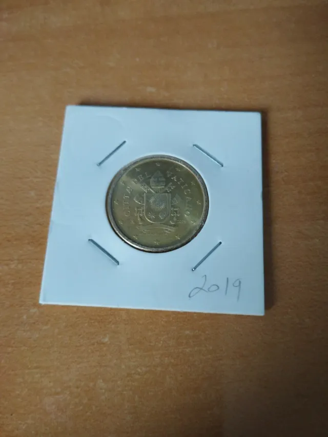 Moneda de 50 céntimos de la Ciudad del Vaticano, año 2019. - Diseño con el escudo papal. - Canto estriado.