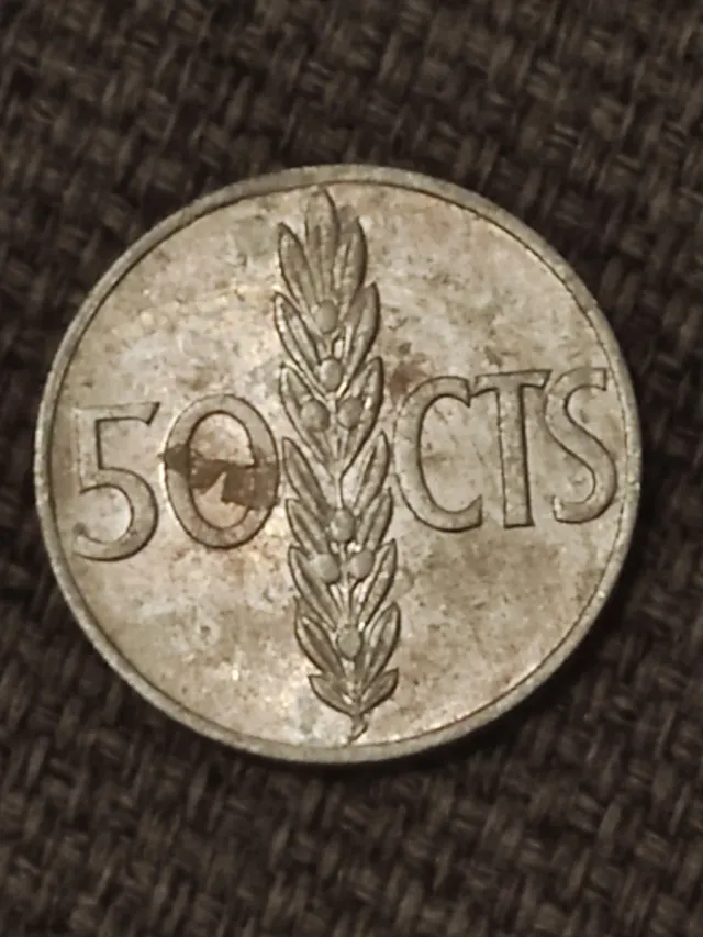 Moneda de 50 céntimos del año 1966. - Presenta una estrella con la marca 71. - Diseño con espiga central.