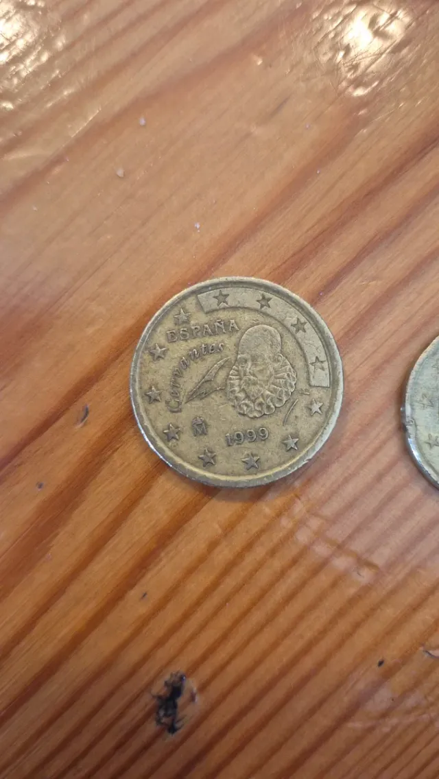 Moneda conmemorativa de 50 céntimos de euro de España, acuñada en 1999. - Diseño con retrato de Cervantes. - Borde decorado con estrellas.