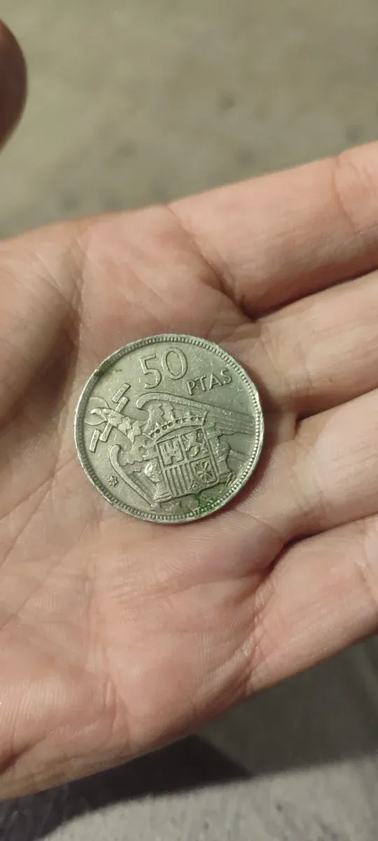 Moneda de 50 pesetas del año 1957. Presenta el escudo de España. - Valor: 50 Pesetas - Año: 1957 - Diseño: Escudo de España - Estrella 59