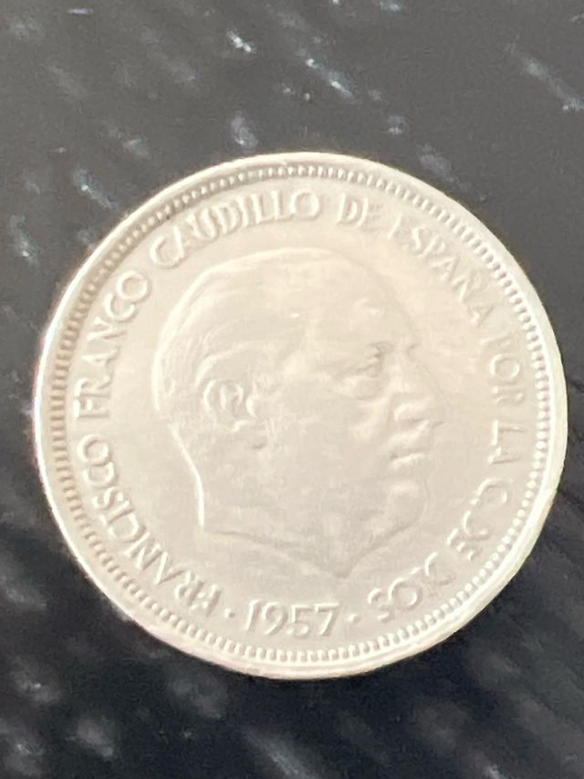 Detalles del productoPreciosa moneda de 50 pesetas españolas del año 1957. En ella aparece el Caudillo Francisco Franco. Se encuentra en buen estado de conservación. - Moneda de colección. - 50 Ptas. - Año 1957.