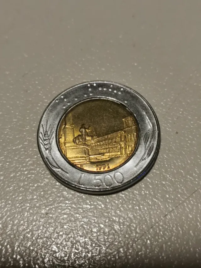Moneda conmemorativa italiana de 500 liras del año 1991. - Diseño del Coliseo Romano. - Borde plateado y centro dorado. - Inscripción L 500 y 1991.