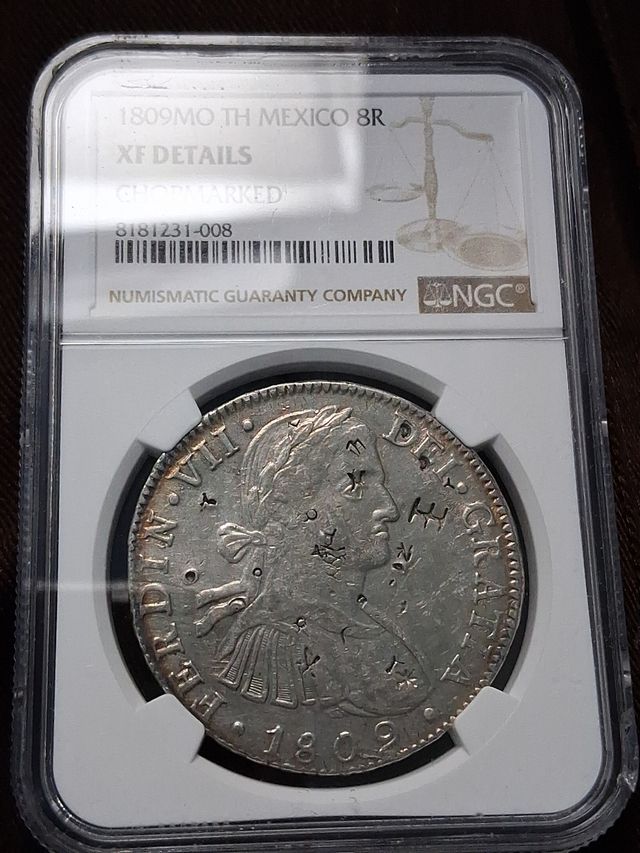 Moneda fernandoVll 1809 ceca mexico .encapsulado por NCG como auténtica XF Details con resello chino