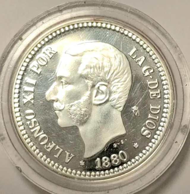 Detalles del productoMoneda conmemorativa de Alfonso XII, acuñada en el año 1880.