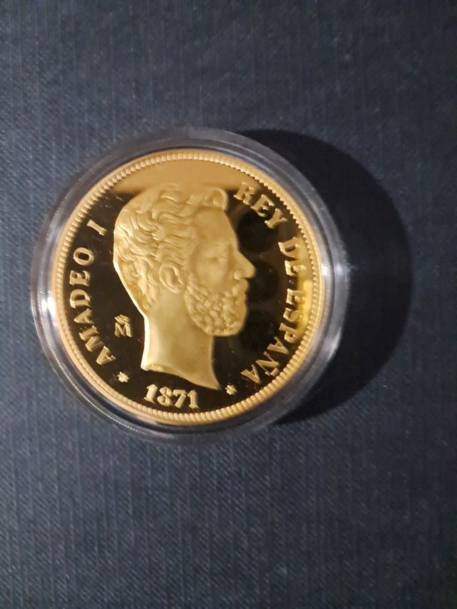 Detalles del productoMoneda conmemorativa de Amadeo I, Rey de España, acuñada para la Historia de la peseta ,44 gramos de plata de 925 bañada en oro de 24 quilates