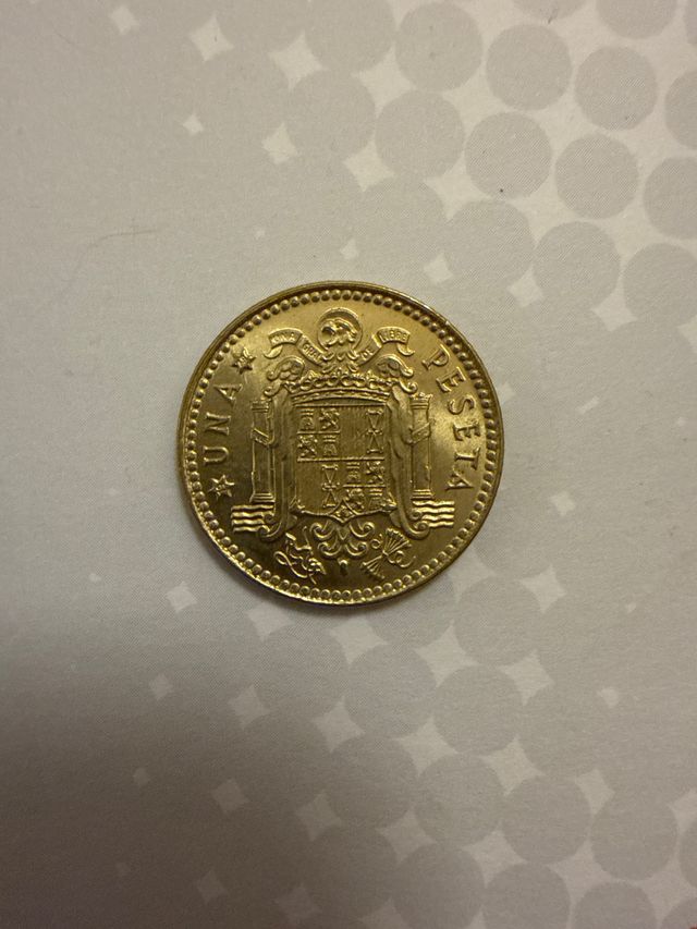 Moneda antigua de una peseta española. - Diseño con escudo. - Borde con puntos.