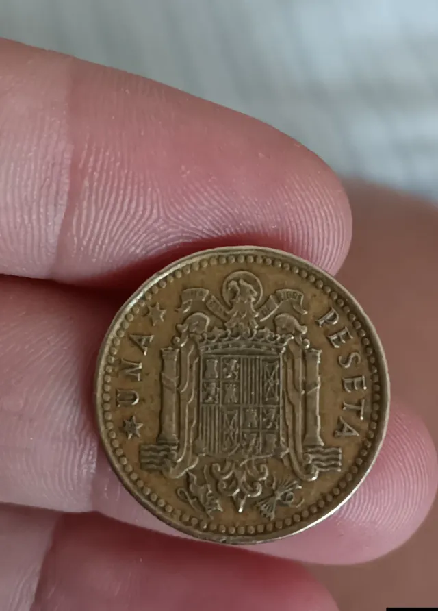 Moneda antigua de 1 peseta de España. - Diseño con escudo. - Inscripción UNA PESETA. Podemos negociarla