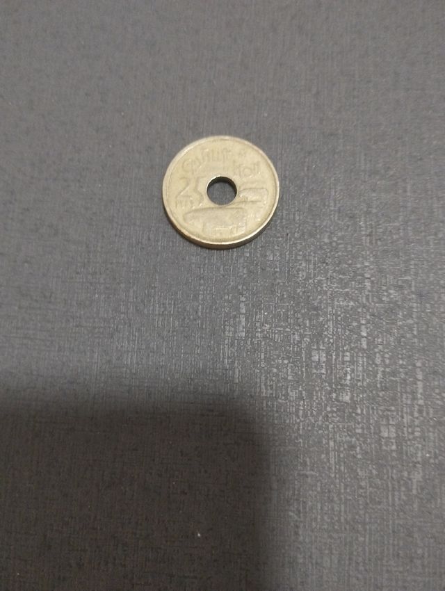Moneda antigua con un agujero en el centro. - Diseño con inscripciones y figuras. - Color dorado.