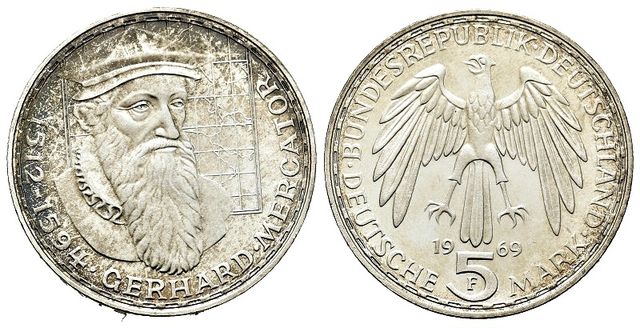 Reverso: el busto de Gerhard Mercator, frente al espectador.