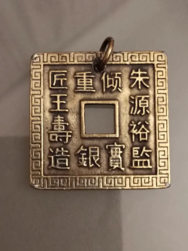 Detalles del productoColgante con diseño de moneda antigua china, con caracteres grabados y un hueco cuadrado en el centro. El borde está decorado con un patrón geométrico.