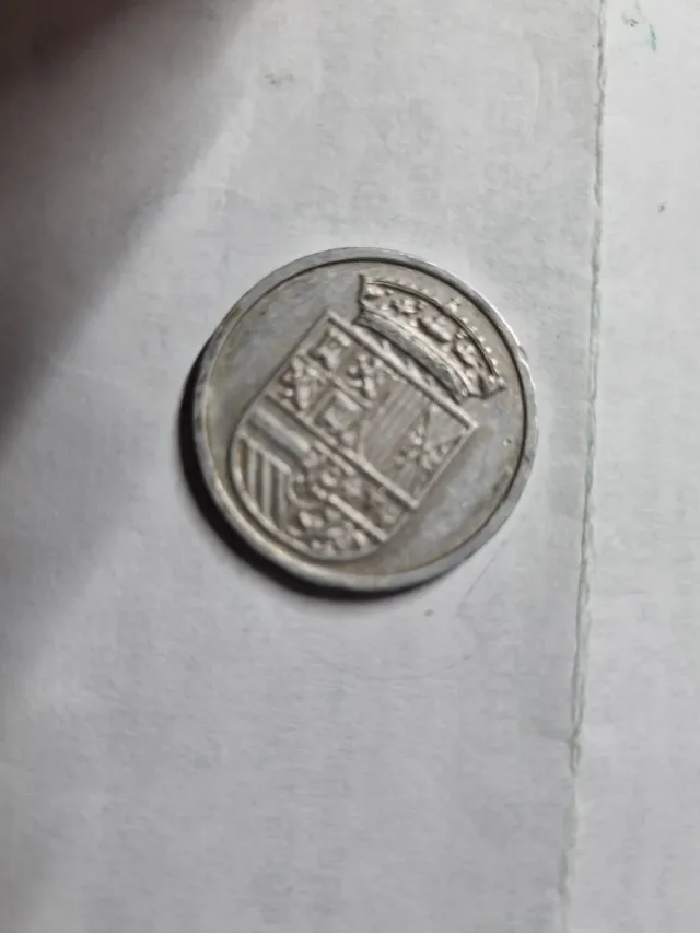 Moneda antigua con un diseño de escudo. - Diseño detallado del escudo. - Borde con patrón.