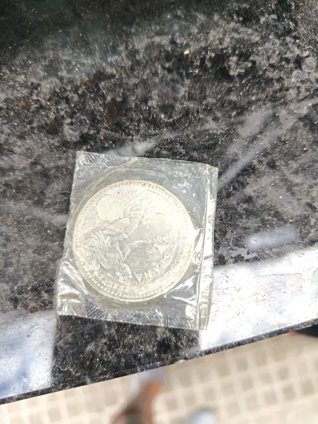 Moneda antigua de plata, conservada en su envoltorio protector. - Diseño detallado en relieve. - Material: Plata.