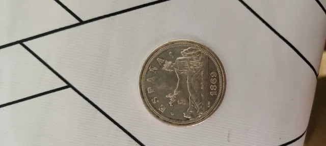 Moneda antigua de España con el año 1869. - Diseño detallado con figura. - Borde con relieve.