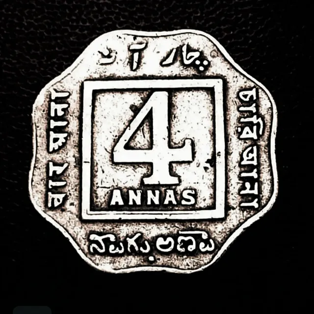 Moneda antigua de la India, con el valor de 4 Annas 1920 - Inscripción en urdu y telugu. - Diseño cuadrado central con el número 4.