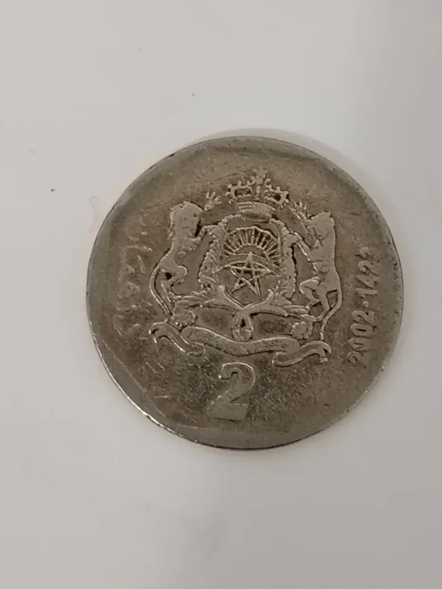 Moneda de Marruecos con valor de 2 Dirhams, acuñada en el año 2002. - Diseño del escudo de Marruecos.