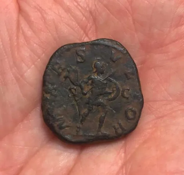 Moneda antigua con figura central y leyenda. - Diseño detallado. - Material: Bronce o similar.