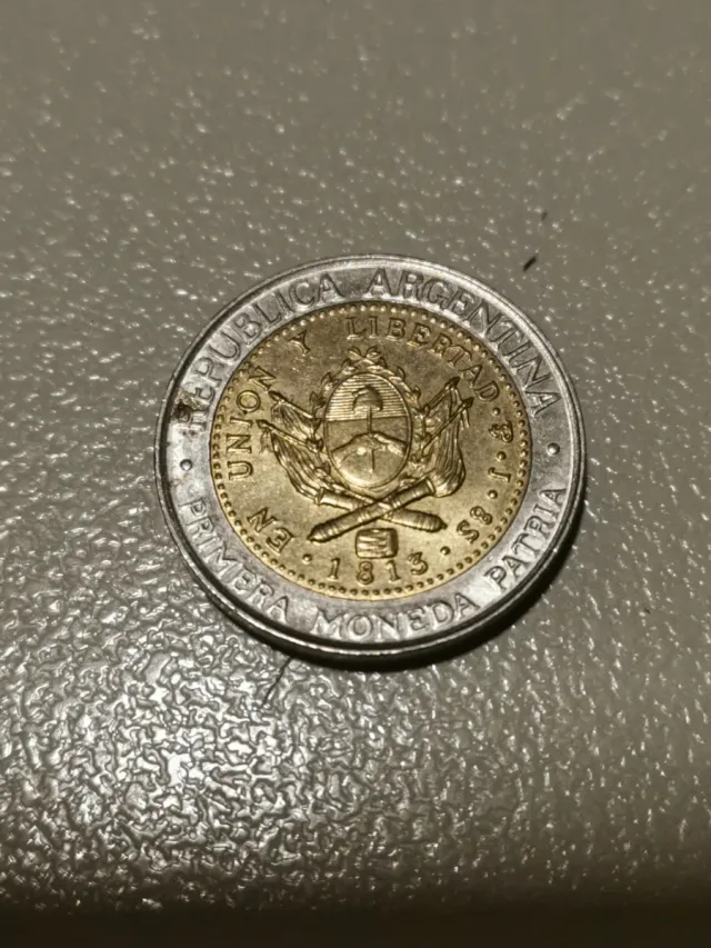 Moneda conmemorativa de la República Argentina. - Diseño central con escudo y laureles. - Inscripción Unión y Libertad y Primera Moneda Patria. - Año 1813.